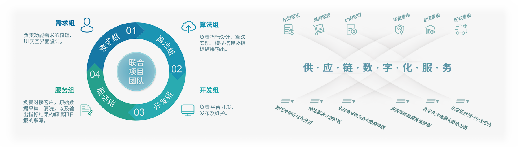 以“業(yè)務(wù)+技術(shù)”的工作模式,派駐數(shù)字化服務(wù)團(tuán)隊(duì)與客戶開展聯(lián)合辦公,通過(guò)提供業(yè)務(wù)診斷、工具開發(fā)、數(shù)據(jù)清洗、模型訓(xùn)練等服務(wù),幫助客戶將物聯(lián)網(wǎng)、人工智能、大數(shù)據(jù)分析等前沿技術(shù)嵌入其核心業(yè)務(wù)流程,助力客戶企業(yè)以更快速度、更大規(guī)模推動(dòng)供應(yīng)鏈發(fā)展與變革。